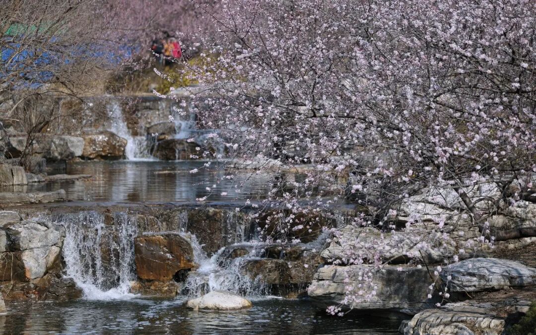 春风送暖,桃韵芬芳,位于曹雪芹纪念馆西侧的山桃花溪已进入最佳观赏期。叠水潺潺蜿蜒,清浅碧波顺石而下,粉白山桃临水而立、一展芳颜,层层花影点亮满园春色。