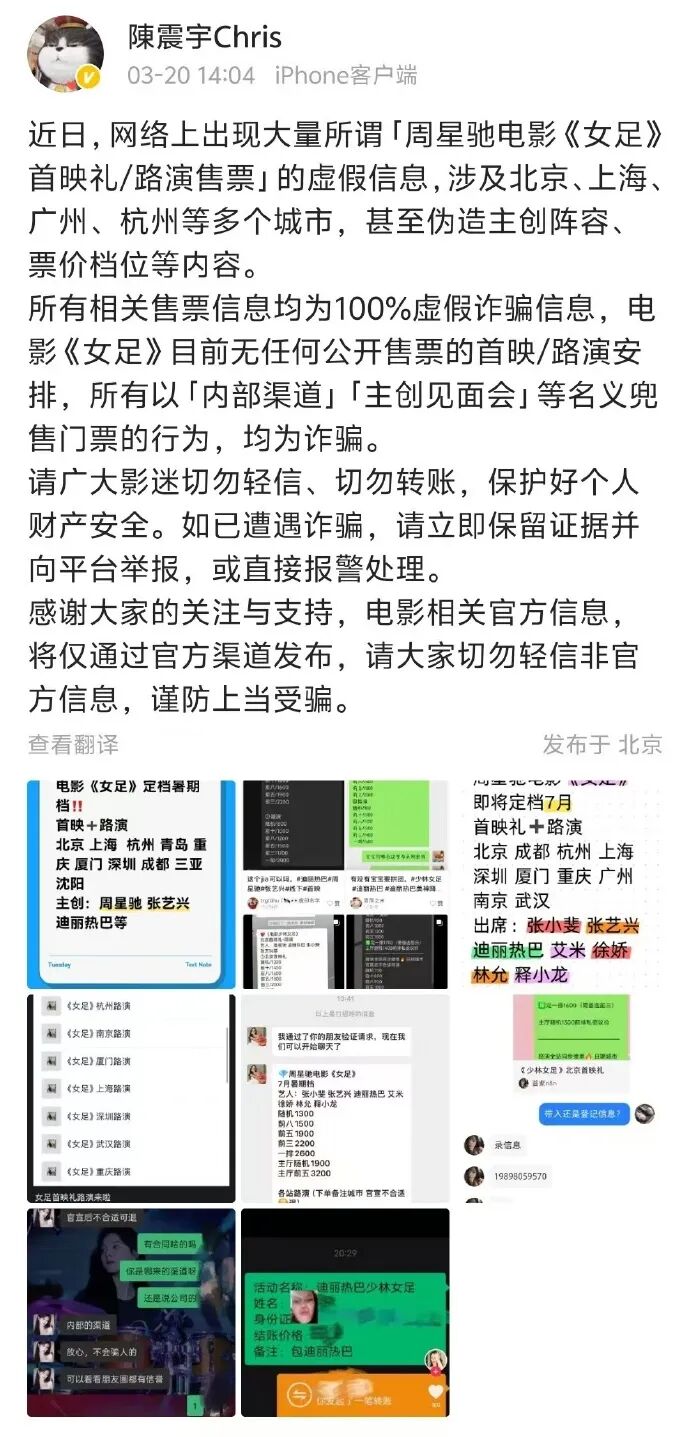3月20日,周星驰经纪人陈震宇发文辟谣电影《女足》相关传闻,全文如下:近日,网络上出现大量所谓「周星驰电影《女足》首映礼/路演售票」的虚假信息,涉及北京、上海、广州、杭州等多个城市,甚至伪造主创阵容、票价档位等内容。所有相关售票信息均为100%虚假诈骗信息,电影《女足》目前无任何公开售票的首映/路演安排,所有以「内部渠道」「主创见面会」等名义兜售门票的行为,均为诈骗。请广大影迷切勿轻信、切勿转账,保护好个人财产安全。如已遭遇诈骗,请立即保留证据并向平台举报,或直接报警处理。感谢大家的关注与支持,电影相关官方信息,将仅通过官方渠道发布,请大家切勿轻信非官方信息,谨防上当受骗。2025年6月2日,周星驰执导电影《女足》正式杀青。据悉,该片于2025年3月7日在深圳正式开机,全组历时3个月拍摄,迪丽热巴于6月2日完成个人戏份,张小斐、张艺兴也于此前陆续杀青。 《女足》融合少林功夫与足球元素,延续了《少林足球》标志性的“功夫足球” 风格。本片讲述中国女子足球队“峨眉队”征战女足亚冠杯的热血故事,剧情围绕团队从不被看好到逆袭夺冠的成长历程。 《女足》的诞生之路充满戏剧性转折。2023年6月,周星驰在社交平台宣布剧本初稿完成,启动全球海选女演员,从宣布初稿完成到正式杀青,历时2年之久。 在2023年10月15日,周星驰在社交平台晒出与韩国知名演员宋康昊的合照,并邀请宋康昊加盟自己新的电影项目,担任裁判。宋康昊曾表示自己是周星驰的粉丝,而周星驰也曾为宋康昊主演的《茅趸王》做过粤语配音。宋康昊是否真的会出现在《女足》中,也是本片一大卖点。