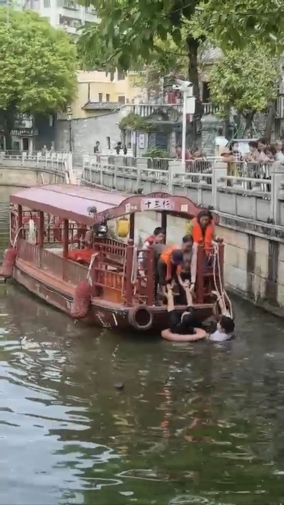 林伟佳回忆,大家将女子救上船时,她的眼睛已经睁开,还在挣扎,岸上的街坊们大声叮嘱她不要乱动。随后,岸上的工作人员和街坊递来梯子,帮助林伟佳等人安全上岸。