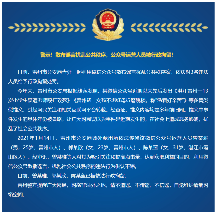 1月17日,平安雷州微信公众号发布警情通报称,日前,雷州市公安局查处一起利用微信公众号散布谣言扰乱公共秩序案,依法对3名违法人员给予行政拘留处罚。 今年来,雷州市公安局根据线索发现,某微信公众号近期以来先后发出《湛江雷州一13岁小学生疑遭老师殴打致死》《雷州初一女孩不堪继母折磨跳楼,称“活着好辛苦”》等多篇类似推文,引起网民关注和相关互联网平台转载。经查证,推文内容均是多年前旧闻。推文中事件发生的具体年份被省略,让广大网民误以为事件是近期发生的,在社会上造成恶劣影响,扰乱了社会公共秩序。 2021年1月14日,雷州市公安局城外派出所依法传唤该微信公众号运营人员曾某雅(男,25岁,雷州市人)、郭某欣(女,23岁,雷州市人)、陈某蓝(女,31岁,湛江市霞山区人)。经审讯,曾某雅等人对其为吸引关注和提高点击量,达到获取利益的目的,利用微信公众号散播谣言,扰乱社会公共秩序的违法行为供认不讳。 目前,曾某雅、郭某欣、陈某蓝已被依法行政拘留。 雷州警方提醒广大网民,网络非法外之地,请不造谣、不传谣、不信谣,自觉维护清朗网络空间。 来源:信息时报 |