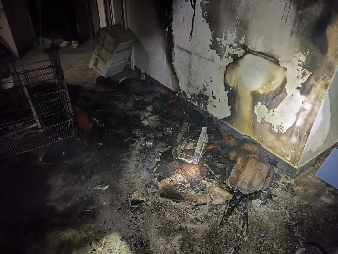 租客立马清醒,惊慌之余 赶紧叫唤其他租客逃离火场 底下的鞋柜等可燃物被引燃 火势正在蔓延 消防员赶到现场时 迅速出水将火扑灭 客厅墙壁过火严重 天花板、吊顶被熏得漆黑 鞋柜烧得只剩空架 所幸发现及时 未造成人员伤亡
