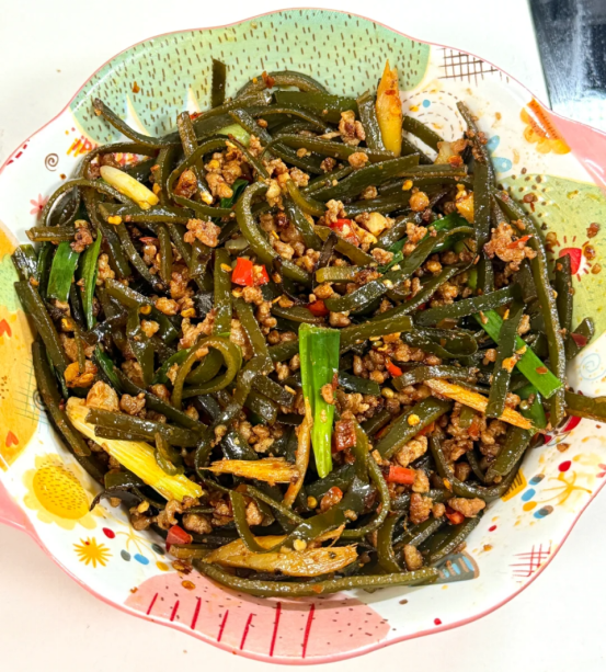 - 热油炒散肉丝,放配菜炒香,加海带翻炒,调入生抽、醋、盐炒匀出锅