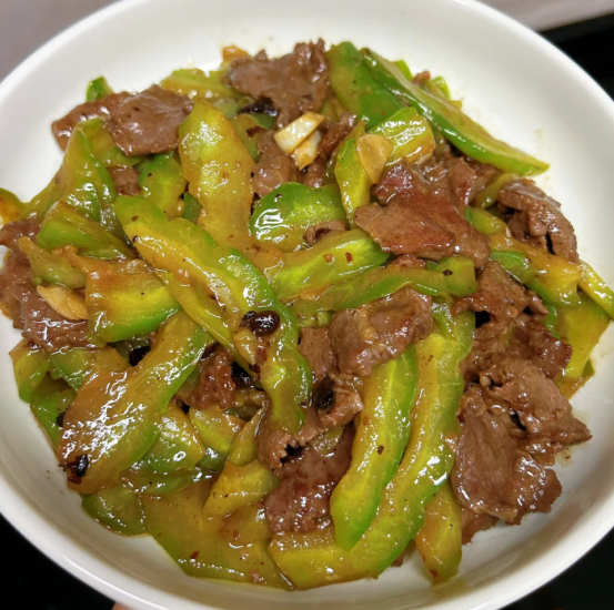 - 热油爆香蒜末、豆豉,下牛肉炒至变色,加苦瓜片大火炒1分钟出锅