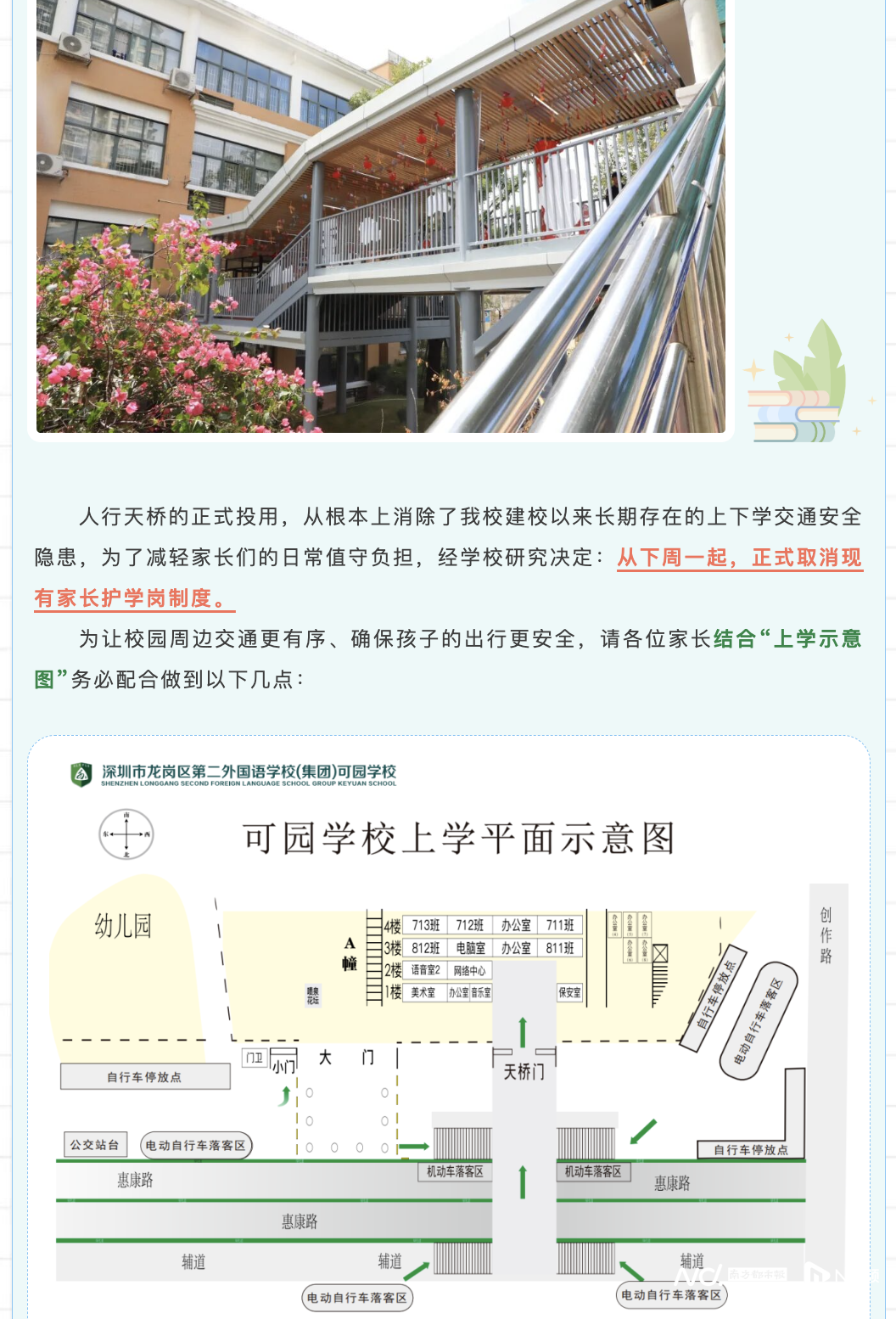 值得留意的是,在深圳市龙岗区第二外国语学校(集团)可园学校宣布取消家长护学岗制度的背后,学校从另一角度尝试解决上下学的交通安全隐患。学校在其公众号中表示,通过新建的接驳天桥连廊,学校成功实现了校园周边人车分流。人行天桥的正式投用,消除了建校以来长期存在的上下学交通安全隐患,为了减轻家长们的日常值守负担,学校决定正式取消现有家长护学岗制度。