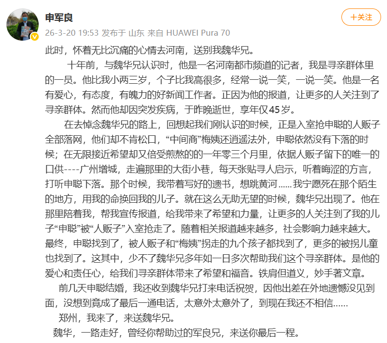 3月21日,潜逃23年的拐卖案关键人物“梅姨”落网。(前情回顾:“梅姨”落网,律师:很可能被判死刑!多名受害者发声:等这一天等了十多年,希望寻回更多被拐儿童) 而在3月20日,被“梅姨”拐卖的儿童申聪的父亲申军良,发布了一个悲伤的消息:十年前,曾在他四处寻子绝望无助的时候,帮他宣传报道,给予他希望和力量的河南广播电视台都市频道记者魏华,于3月19日深夜,因突发心脏疾病不幸去世,年仅45岁。 魏华是谁? 他的名字你可能没听过 但他的报道你一定知道 他带领团队推出新闻调查《边境“蛇”影》《缅北归来》,和同事一起卧底120天,从缅北营救回6名被困电信诈骗组织的人员。报道发出后,炸醒了无数“高薪梦”的年轻人,用真相阻止了下一个悲剧;