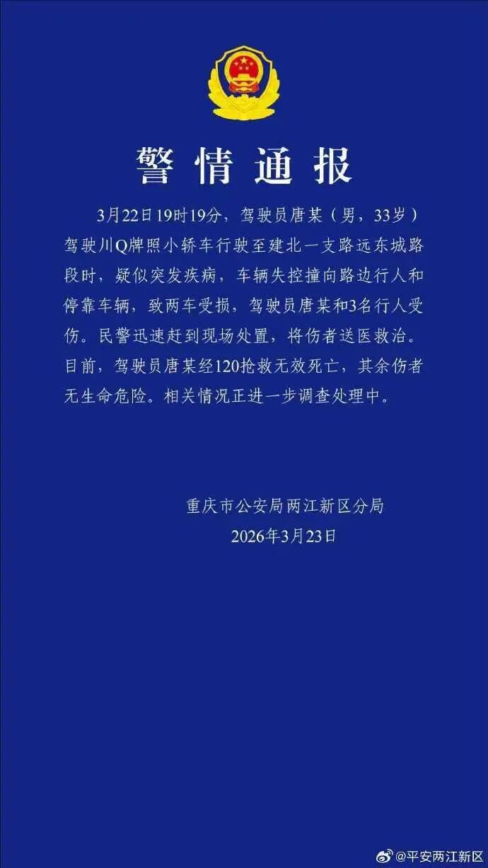 事发截图现场监控视频显示,3月22日19时19分左右,肇事轿车撞向人群,多人被撞。一名现场目击者告诉极目新闻记者,她看到车辆突然撞向人群,离她只有几米的距离,“感觉没减速,我被吓懵了。” 23日0时许,极目新闻记者从重庆警方获悉,3月22日19时19分,驾驶员唐某(男,33岁)驾驶川Q牌照小轿车行驶至建北一支路远东城路段时,疑似突发疾病,车辆失控撞向路边行人和停靠车辆,致两车受损,驾驶员唐某和3名行人受伤。民警迅速赶到现场处置,将伤者送医救治。