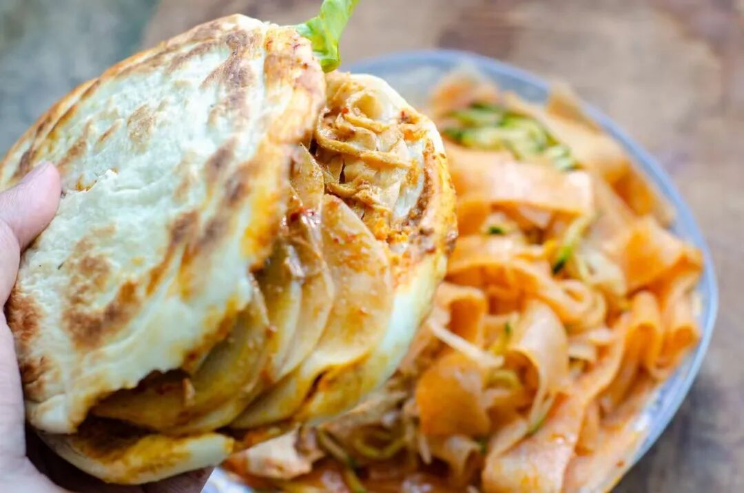 刚炕过的白吉馍有点烫手,中间夹着拌好味道的凉菜,口感脆脆的、韧韧的、水水的,可以连续七天不重样,也可以从夏天吃到冬天。据说,老陕喝酒的时候很少专门点凉菜,更喜欢下楼找个卖菜夹馍的摊档,把饼掰成179°,最后把摊档老板和三轮车全都夹进饼去。