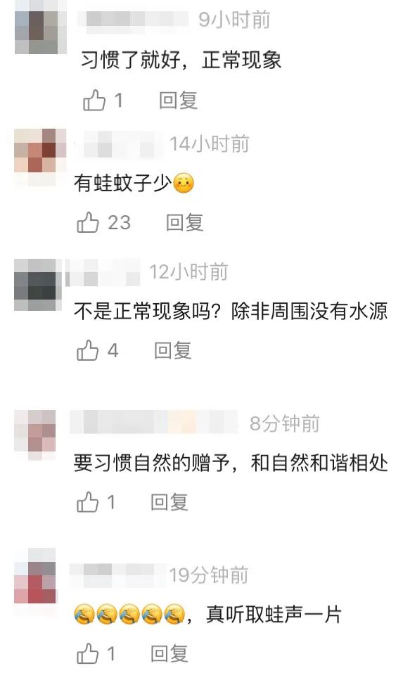 针对这一困扰,该小区物业表示,由于青蛙繁殖速度过快,一直没有得到有效的解决。后续将会继续想办法,将在不破坏生态、不伤害蛙类的前提下,通过放置驱蛙装置、清理杂草、优化水域布局等方式,减少蛙类密集栖息区域,降低蛙鸣传播影响,尽快还业主安静的居住环境。