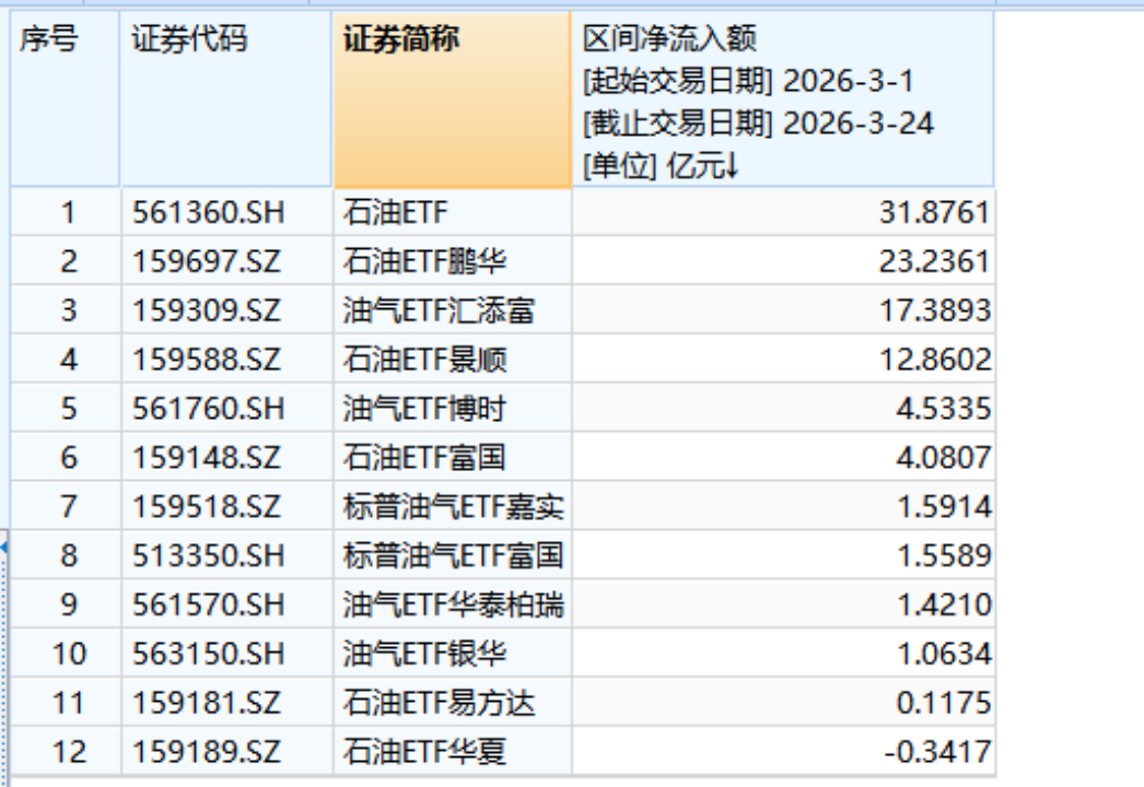 地缘政治变化影响着市场情绪。3月以来,油气、石油类ETF获得资金的青睐,据Wind数据,截至3月24日,12只油气类ETF合计净买入超90亿元。其中,石油ETF国泰(561360)、石油ETF鹏华(159697)净买入额位居前列,分别超过30亿元、20亿元。