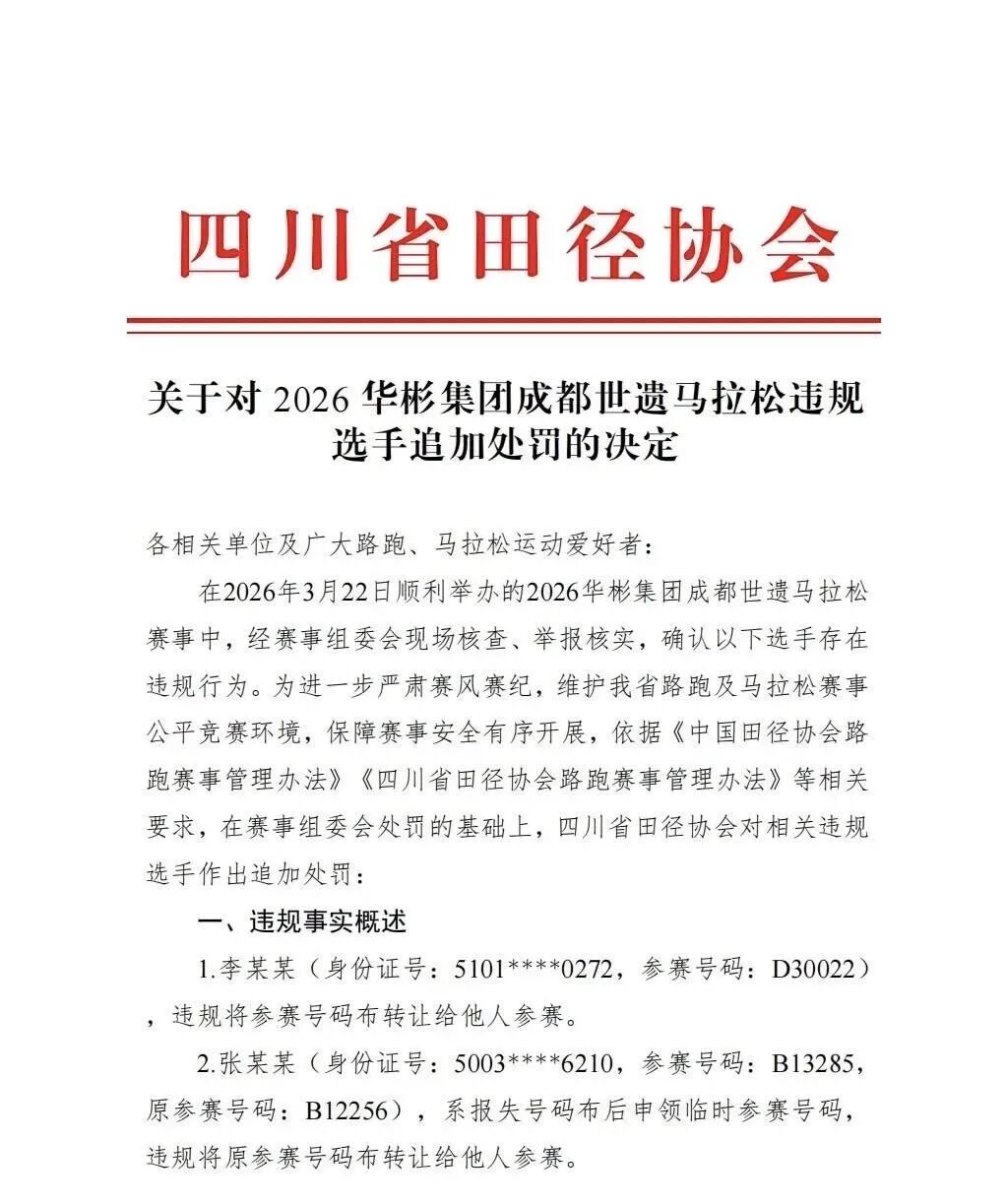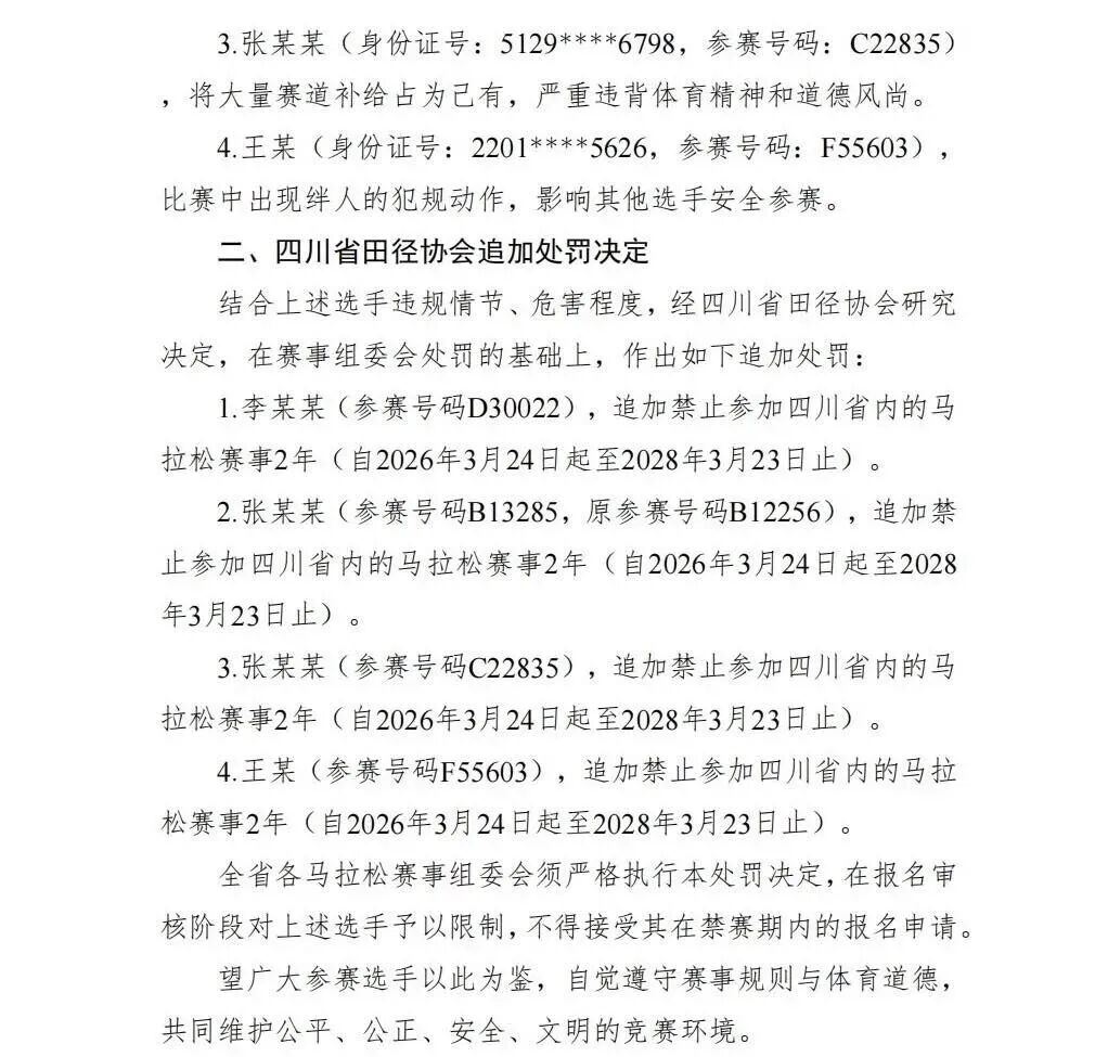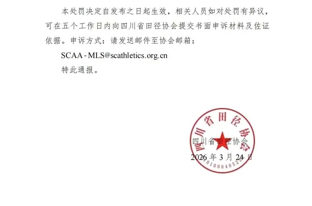 同日,四川省田径协会也追加了一份处罚决定,宣布禁止二人参加四川省内举办的马拉松赛事两年,禁赛期自2026年3月24日起至2028年3月23日止。
