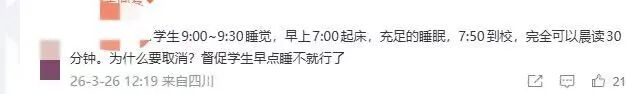 “表面看是少了半小时早读,实际上可能换来的是一整天状态更稳一点,可能有部分家长顾虑,双职工家庭怎么接送?少了统一早读,会不会变成‘形式取消,实际照旧’,还有人担心学习节奏被打乱,但压力并没有减少。”这位家长觉得,真正值得关注的,不是取消没取消,而是取消之后有没有配套,到校时间怎么衔接、课堂效率怎么提、作业量会不会调整。