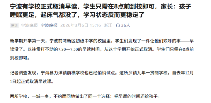 浙江宁波也有学校已经取消早读。