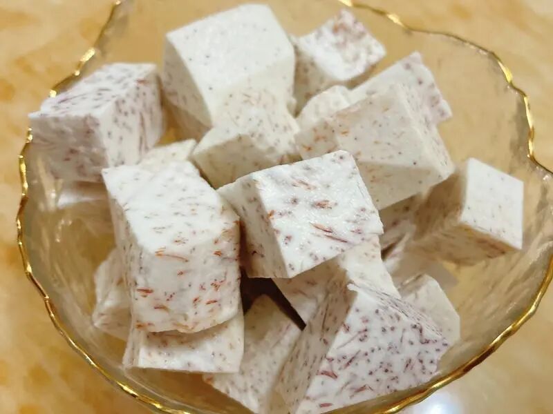 去皮后的香芋切成2厘米左右的小块,切好后可以放入清水中浸泡一会儿,防止氧化发黑,备用即可。