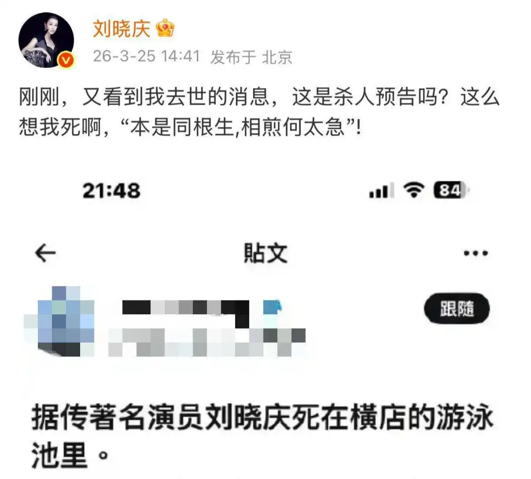 “刚刚,又看到我去世的消息,这是杀人预告吗?这么想我死啊。本是同根生,相煎何太急!”