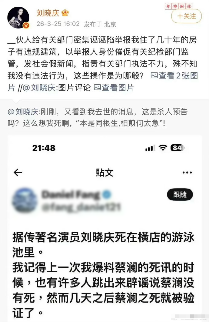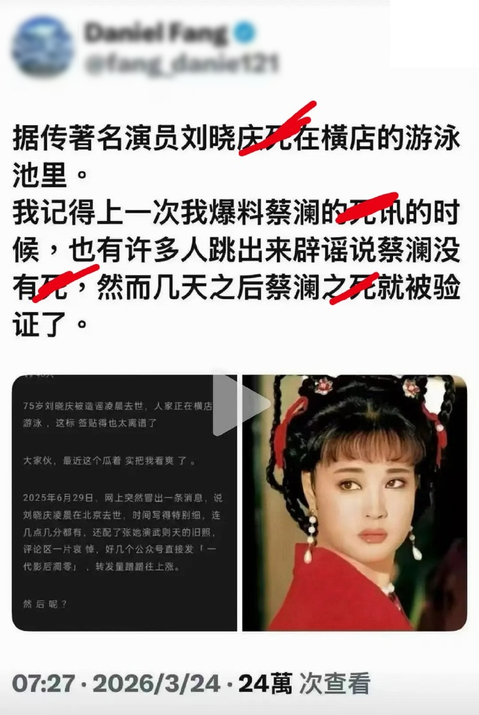 一个叫做“Daniel Fang”的账号在外网发帖,称著名演员刘晓庆死在横店的游泳池。