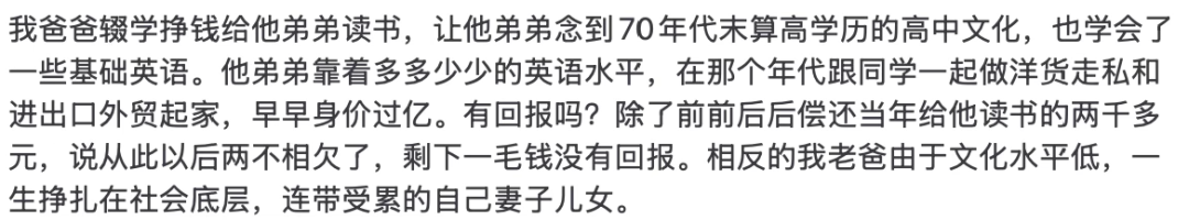 “老爸辍学赚钱给弟弟读书,弟弟出息了发了财,还了当年给他读书的两千多,说从此两家人互不相欠。”