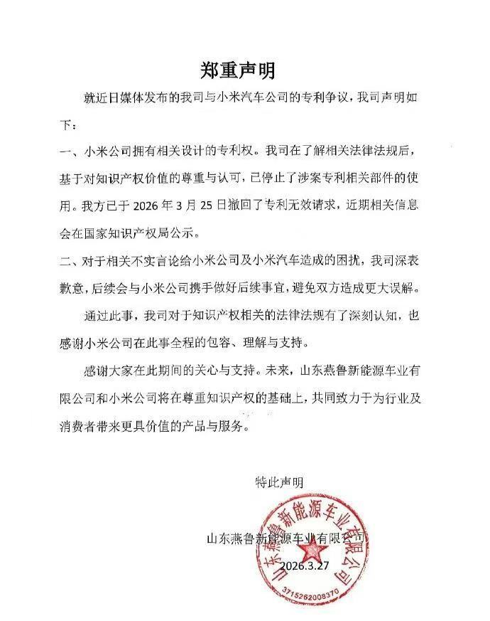 3月27日,“老头乐起诉小米汽车”当事企业山东燕鲁新能源车业有限公司发布声明: