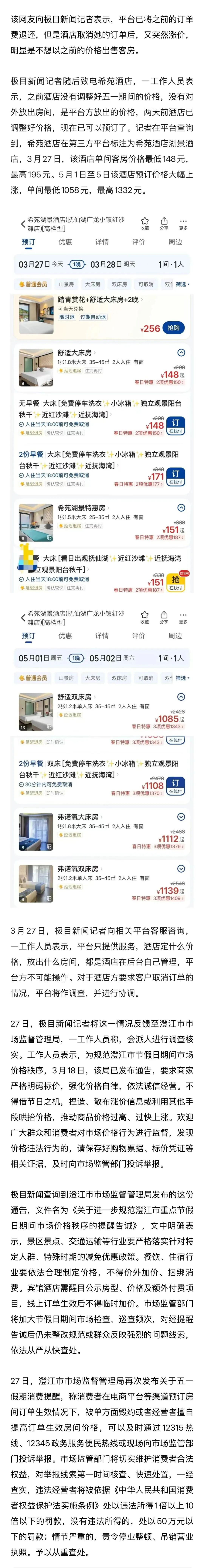 3月27日,一名女网友反映,她之前在第三方平台上预订云南澄江市抚仙湖附近一酒店的客房,下单后对方一直不确认,最后酒店将其订单取消,她准备再次下单时,却发现酒店客房价格突然涨了超10倍。