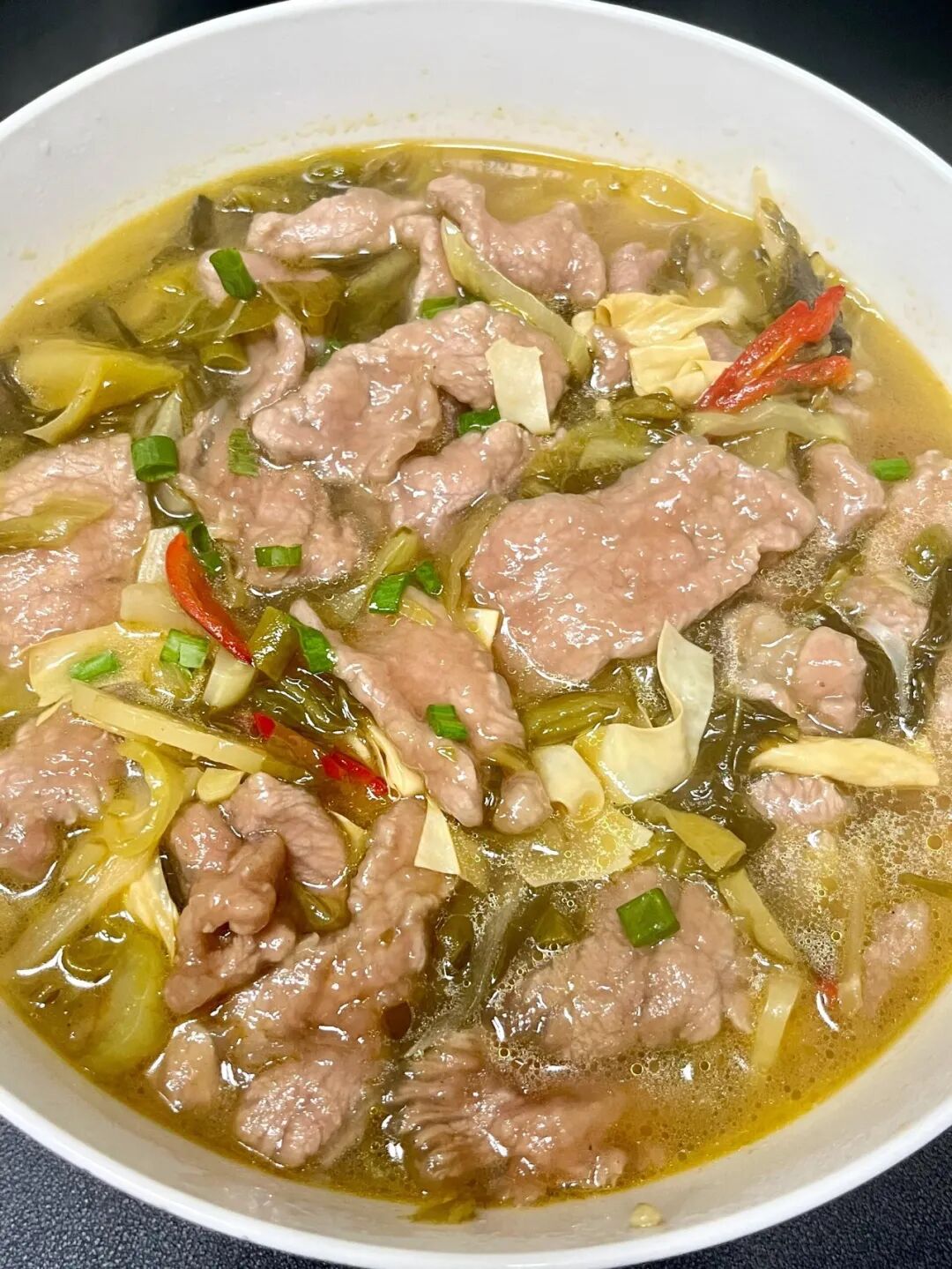 汤底中加少许生抽、鸡精调味。另烧一锅清水,水开后下入挂好粉的肉片,煮至变色捞出,放入酸菜汤中,再煮1分钟即可出锅。