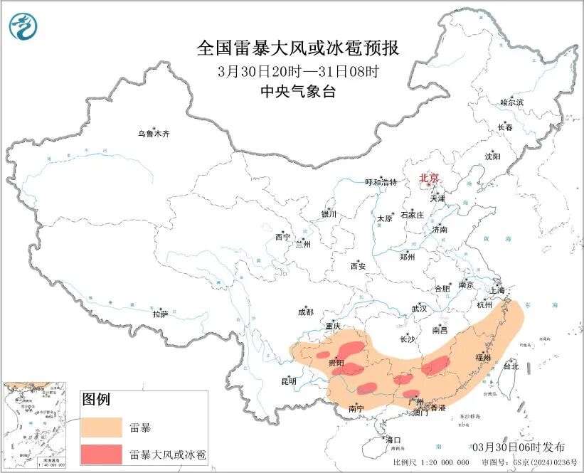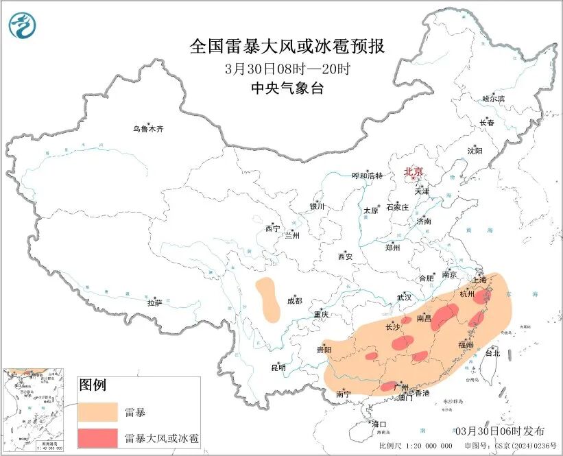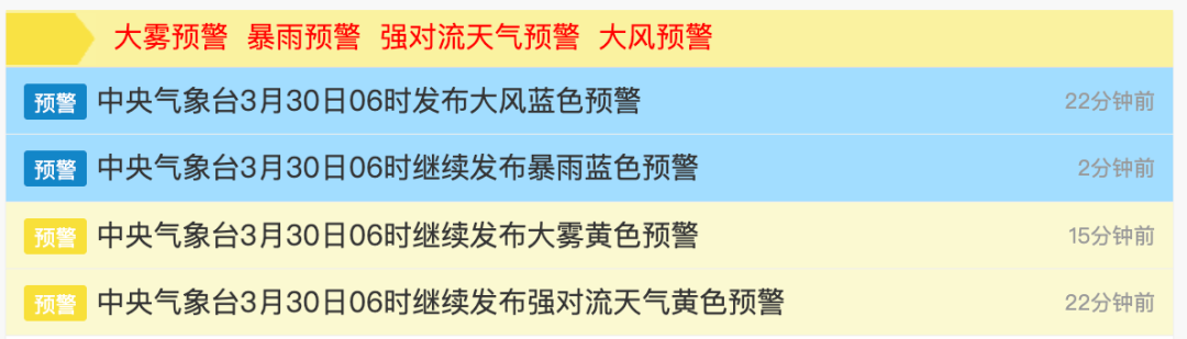 中央气象台3月30日06时继续发布强对流天气黄色预警:
