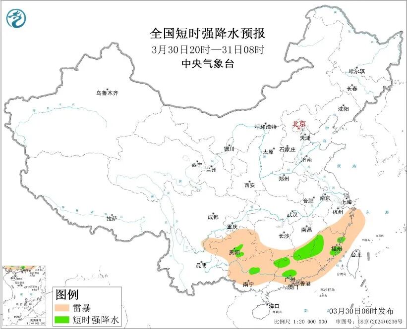 中央气象台3月30日06时继续发布暴雨蓝色预警: