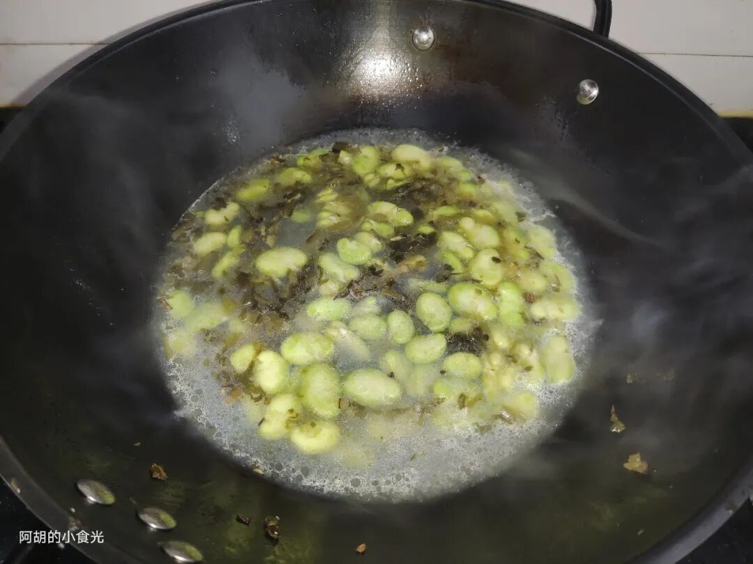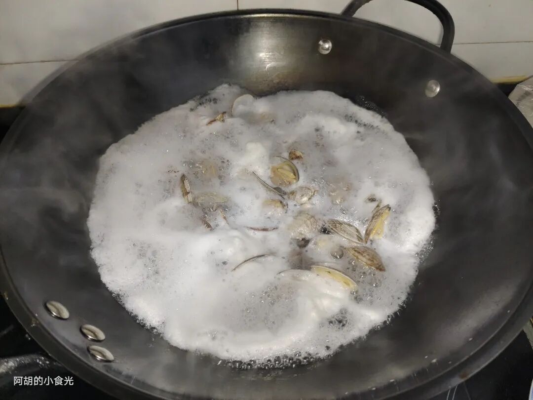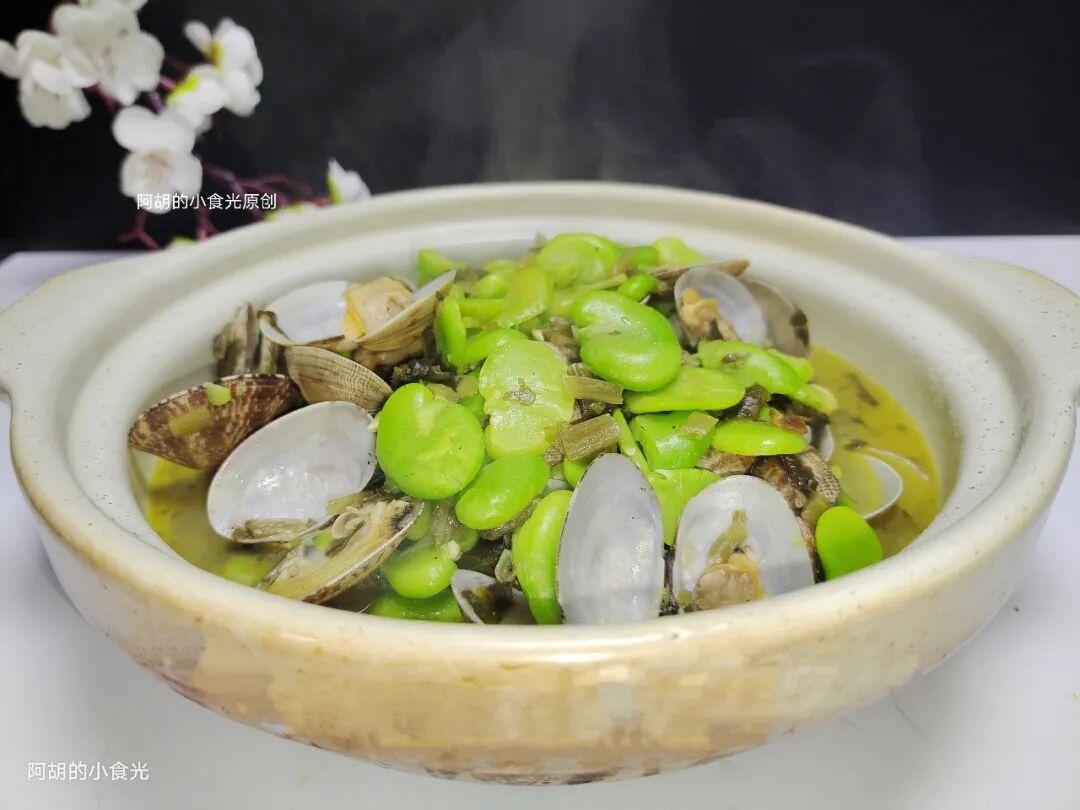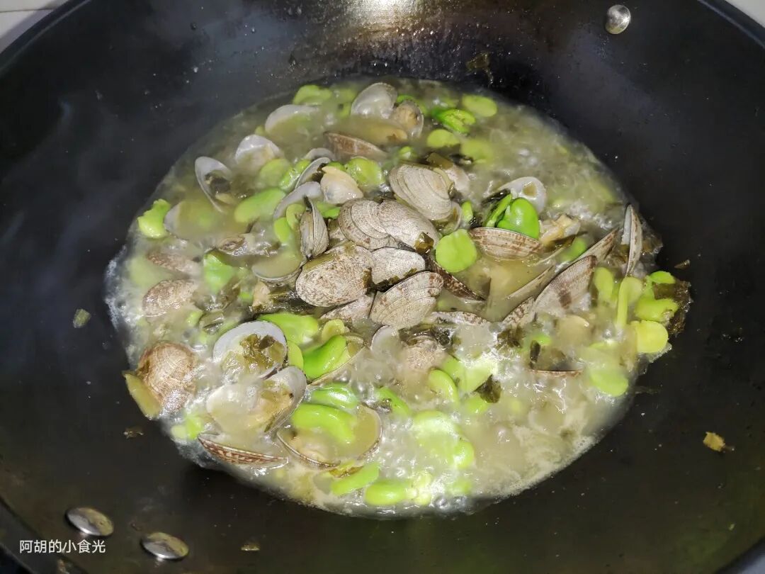 第五步:就这样保持大火煮个三五分钟,让蚕豆仁充分地熟透,最后取出焯水后的花蛤倒入汤汁中,简单翻拌一下后再煮个一分钟左右就可以出锅装盘了。这是一道极具春天味道的汤菜,蚕豆和花蛤、雪菜的搭配太完美,汤鲜菜嫩一口就助你打开好味蕾,感兴趣的一定要试一试这个经典搭配。