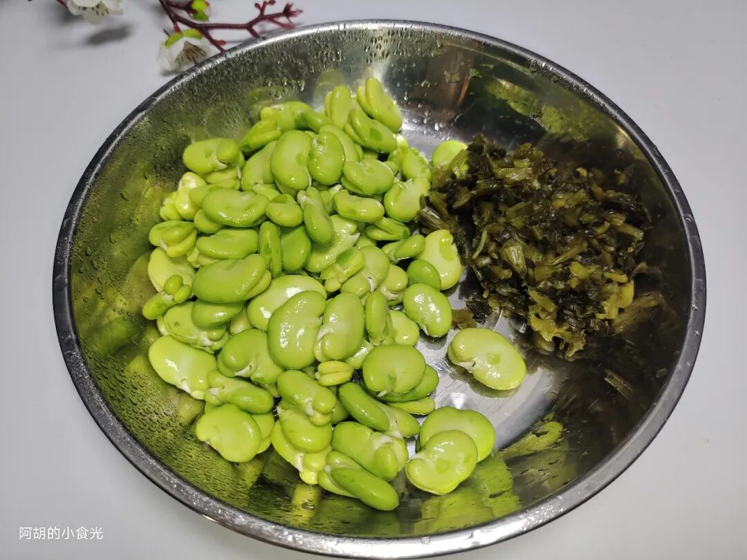 第一步:先来准备鲜蚕豆,去壳后把蚕豆仁的外皮也一块去掉,这样更有利于蚕豆鲜味的释放,淘洗干净后沥干水分备用。而后准备一些腌制的雪菜,用清水洗掉一些盐分后挤干水分后切碎待用。