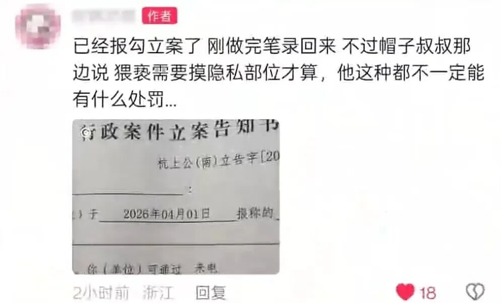事后,该女子在个人社交账号上发布了一张行政立案告知书,并配文:“已经报案立案了,刚做完笔录回来,不过帽子叔叔那边说猥亵需要摸女性隐私部位才算,他这种都不一定能有什么处罚......"