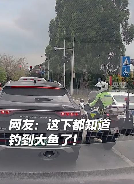 有网友评论调侃,“前车:看我钓的鱼大不大?交警:我看看怎么个事……”