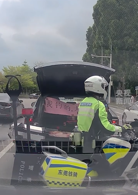 : 4月1日,广东东莞一辆汽车在行驶中突然打开后备箱,里面躺着一条近一米长的大鱼,车厢内还挂着写有“我钓的,大不大”的横幅。没等后车细看,东莞铁骑随即上前,伸手帮其关好后备箱,并到车窗前对驾驶员进行警告。有 ...