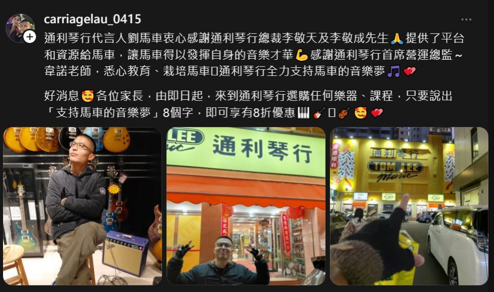 “刘马车”日前在Threads平台发帖,自称是通利琴行代言人,获琴行提供了平台和资源,让他能发挥自身的音乐才华。“刘马车”又提到,消费者如到琴行说出“支持马车的音乐梦”,购买乐器课程即可享有8折优惠。帖文中,“刘马车”同时上载了多张在琴行尖沙咀分店的自拍照。