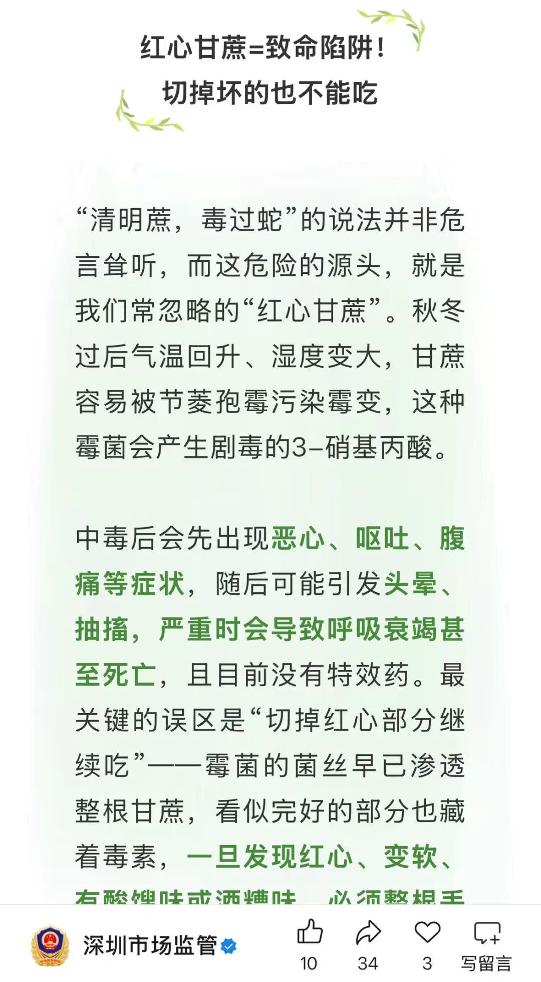 但其实,只要甘蔗霉变,无论是在清明节前后还是其他的季节,一样会导致中毒。