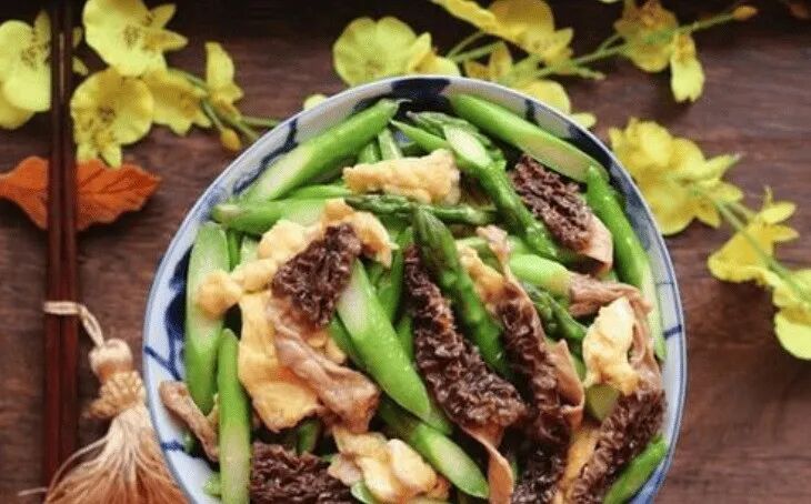 羊肚菌蒸蛋口感嫩滑,味道鲜美,是一道营养丰富的早餐或晚餐选择。 五、羊肚菌炒芦笋材料:羊肚菌、芦笋、蒜、盐、生抽、食用油 做法: - 将羊肚菌用温水泡发,洗净后切成小块;芦笋洗净,切成小段;蒜切成片。
