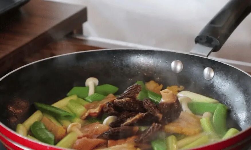 - 锅中再加入少许食用油,放入羊肚菌和火腿丁翻炒片刻。