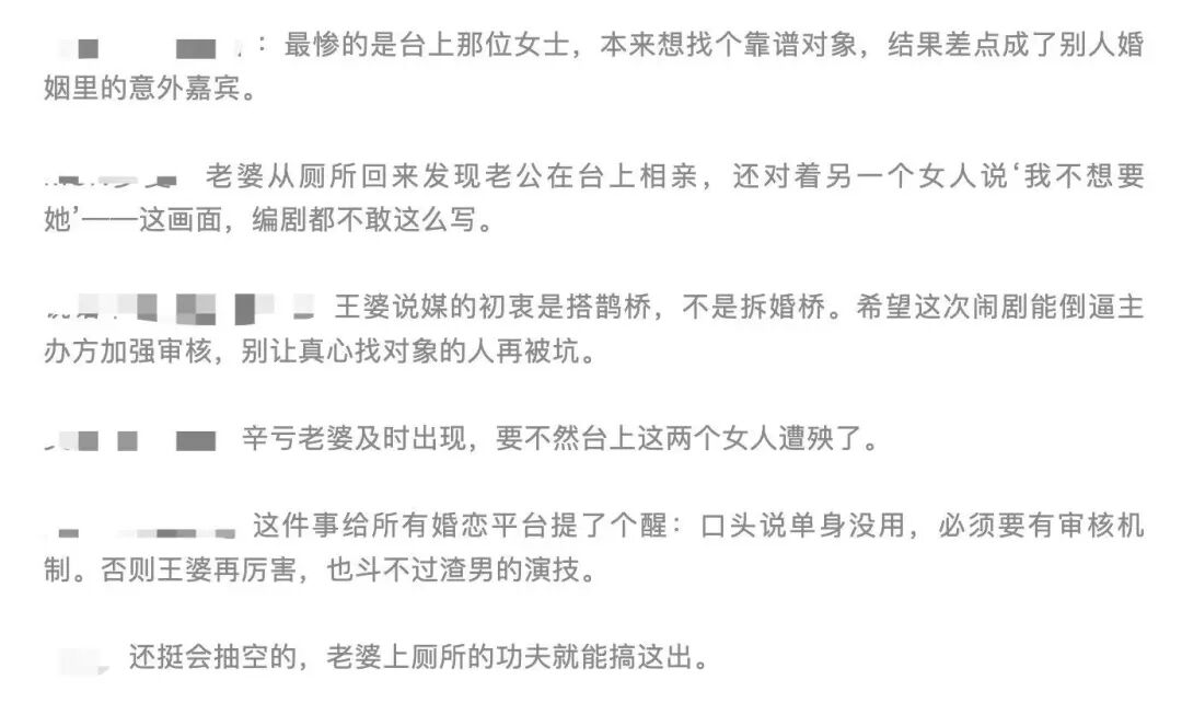 此时,台下一名女子现身自称是该男子妻子。男子则回应“我不想要她,不想跟她结婚”,引发“王婆”当场怒斥其为“渣男”。