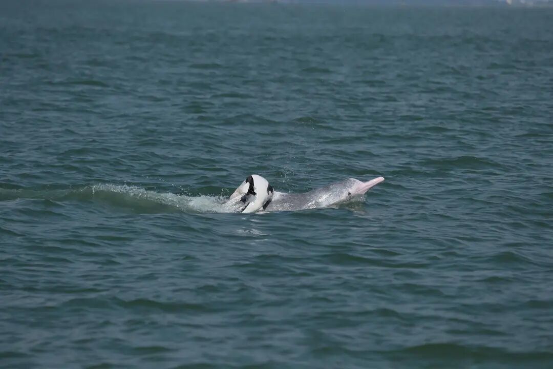中华白海豚,国家一级保护动物,被称为“海上大熊猫”。幼年白海豚全身深灰,老年个体的皮肤呈白色,在剧烈运动时因血液充盈,皮肤泛出淡粉色,被视为吉祥好运的象征。