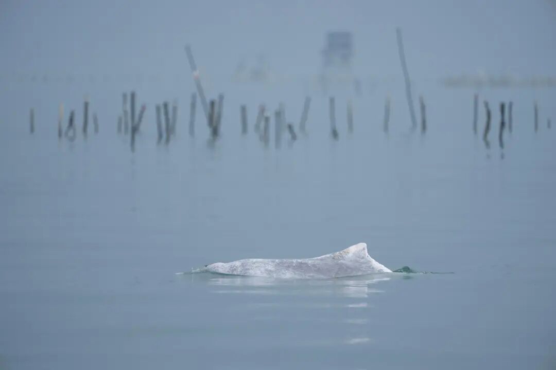 大风江和南流江之间的水域,一头白海豚浮出水面,背后是近岸养殖场 受访者供图