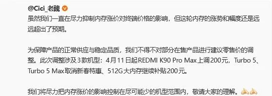 4月3日,小米中国区市场部总经理魏思琪通过社交平台发文,确认因内存成本“远超预期”的上涨,将对三款机型采取上调建议零售价或取消新春特惠的措施。
