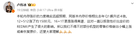 卢伟冰指出,本轮内存涨价的力度确实远超预期,“12+512(GB版本内存)涨了约1500元,16+1T(GB版本)更是涨得离谱”。卢伟冰坦言,这对一直以极致性价比定价的REDMI品牌产生了很大的影响,因此“不得不对部分机型的零售价格做出小幅上涨或者恢复原价”,并希望得到用户的理解。