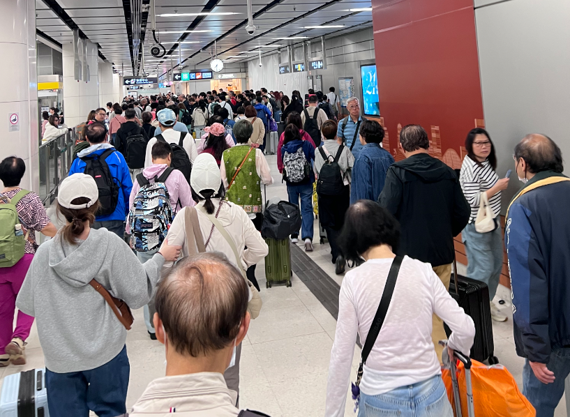 離港人群「逼爆」西九龍高鐵站。