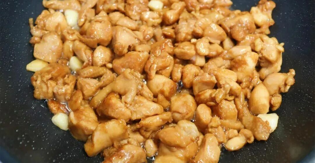 炒鸡块 接着炒鸡肉,锅里再补点油,油热就下鸡块和大蒜,火开到最大,别犹豫,快炒,腌过的鸡肉两三分钟就能熟,颜色由浅变深,边缘稍收紧,肉还在汁里滑,这会儿停手,不要老是翻到出水。