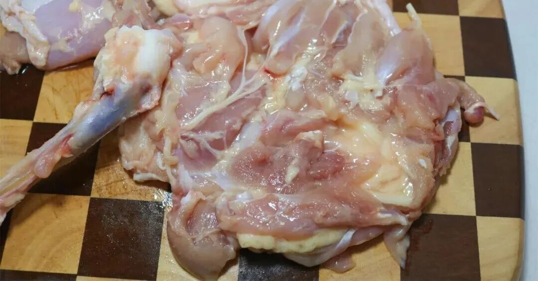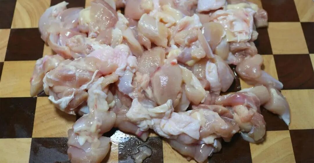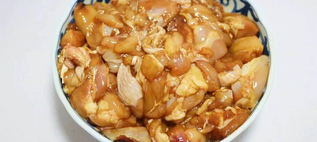 买回两只大鸡腿,去骨洗净挤干水,切成小块。