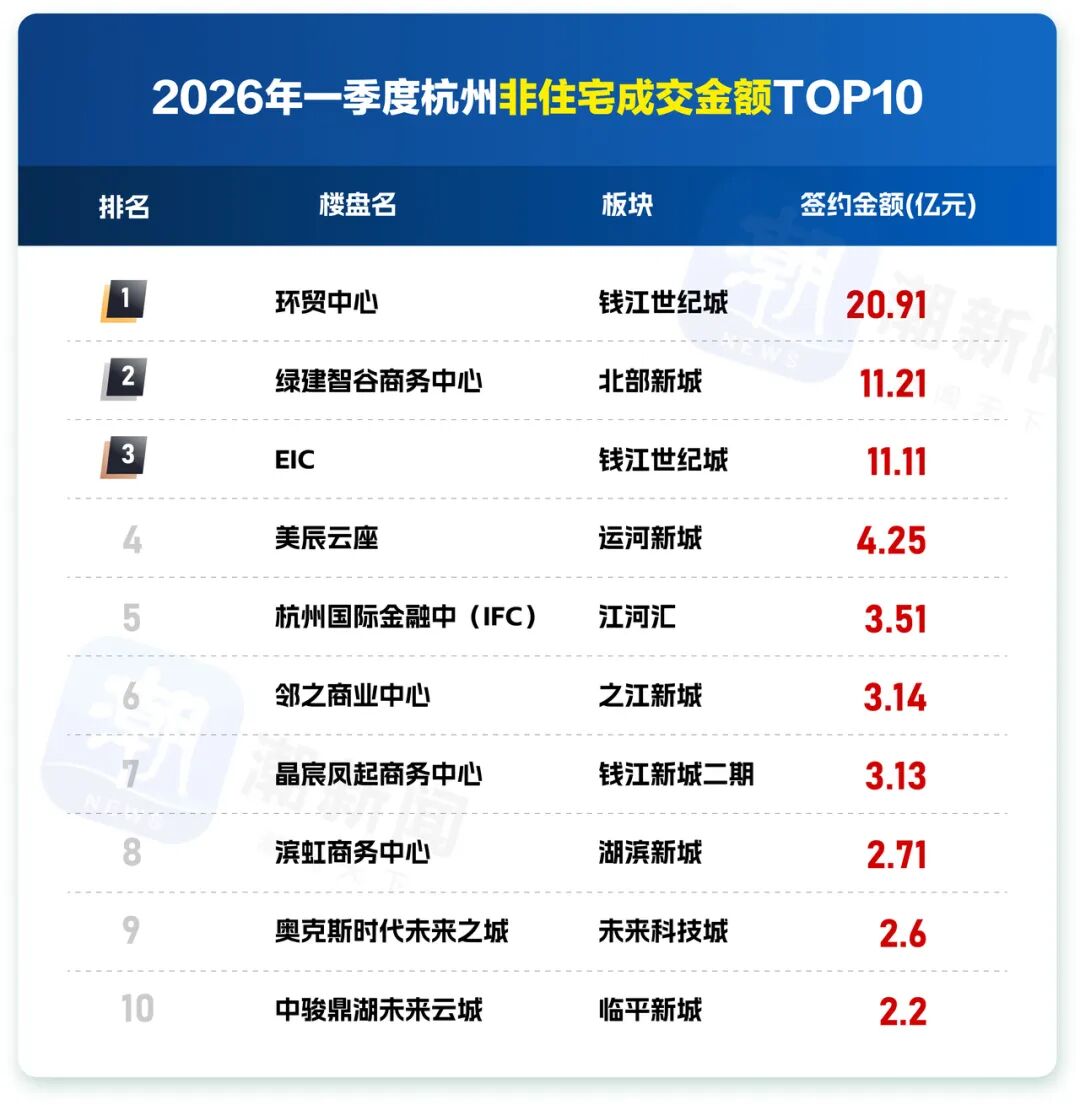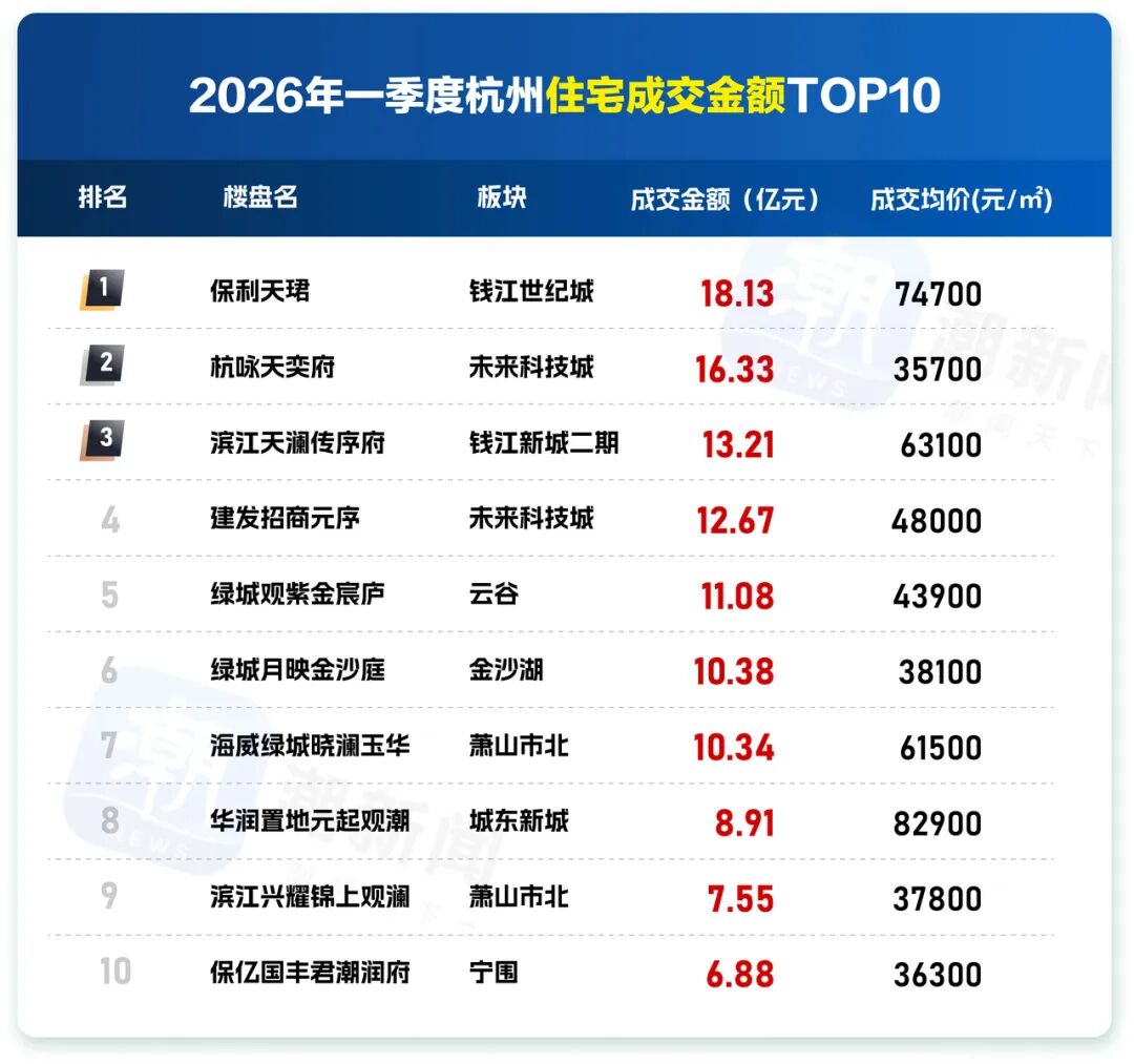 透明售房网数据显示,2026年一季度,杭州住宅成交金额冠军是萧山区的天珺,单盘吸金18.13亿元。第二名是余杭区的天奕府,单盘吸金16.33亿元。这两个楼盘的开发商,均为保利发展。第三名为上城区的天澜传序府,单盘吸金13.21亿元,这也是钱二一季度卖得最好的楼盘。