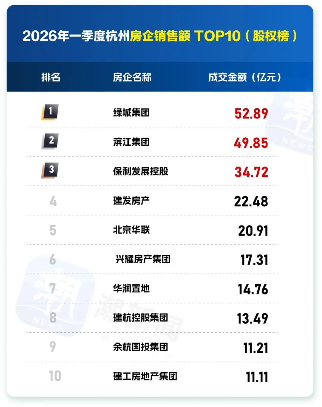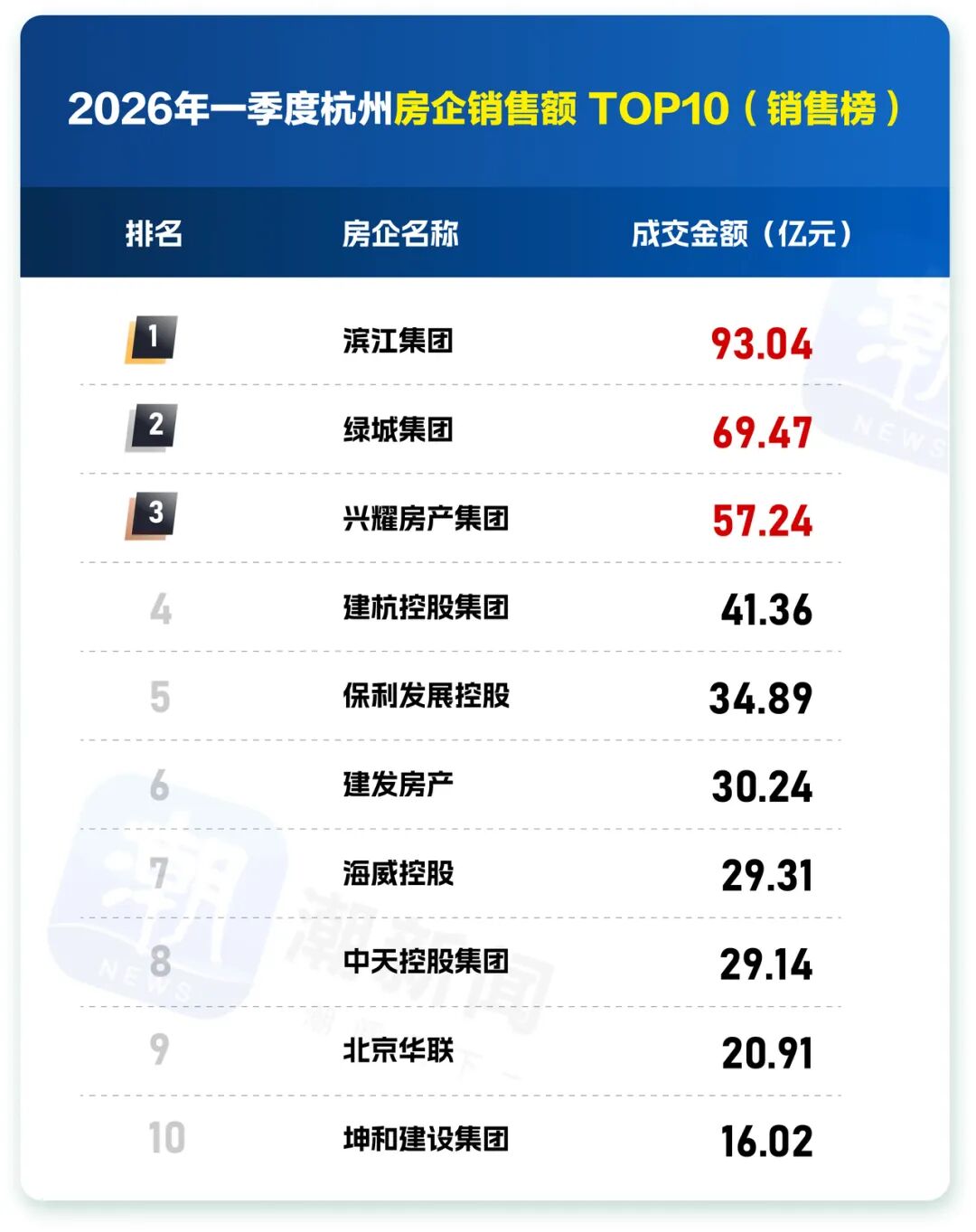 滨江一季度销售额93.04亿元 稳坐杭州房企头把交椅 2026年一季度,滨江集团在杭全口径销售金额93.04亿元,位列房企榜第一名。绿城一季度销售69.47亿元,位列第二;兴耀一季度销售57.24亿元,位列第三名。