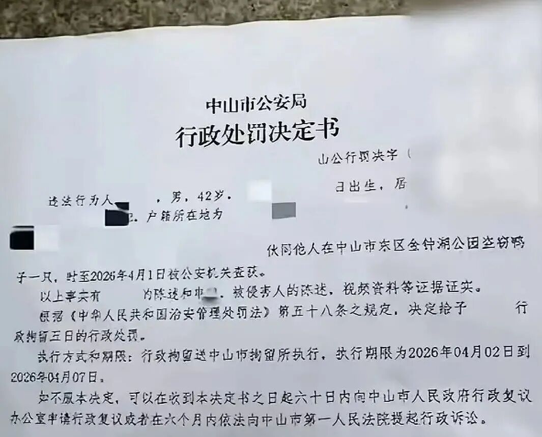 中山市公安局出具的行政处罚决定书显示,依据《中华人民共和国治安管理处罚法》第五十八条之规定,两人分别被处以行政拘留五日的行政处罚。4月3日上午,金钟湖公园工作人员也向记者证实此事,称园方已配合警方调取监控、协助调查。