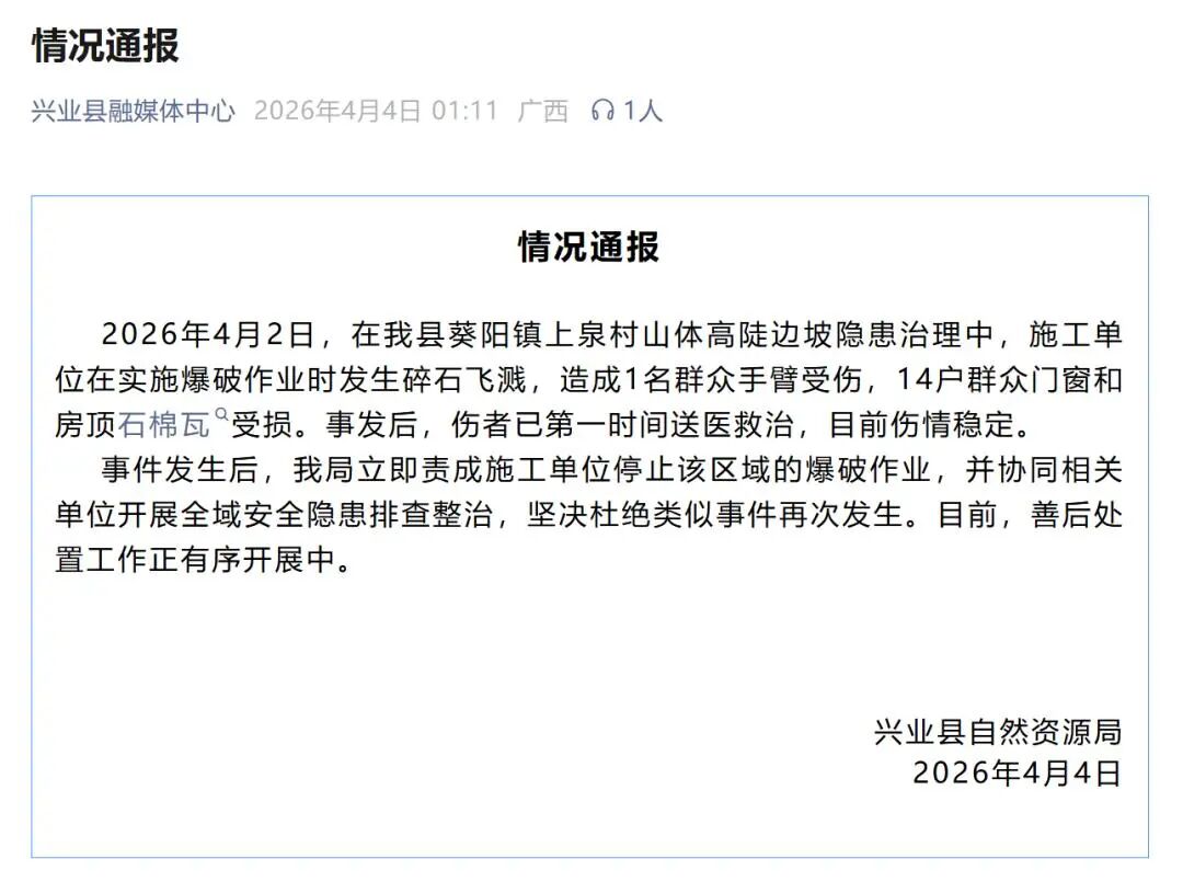 4月4日,广西兴业县自然资源局通报上泉村山体隐患治理爆破碎石飞溅一事。