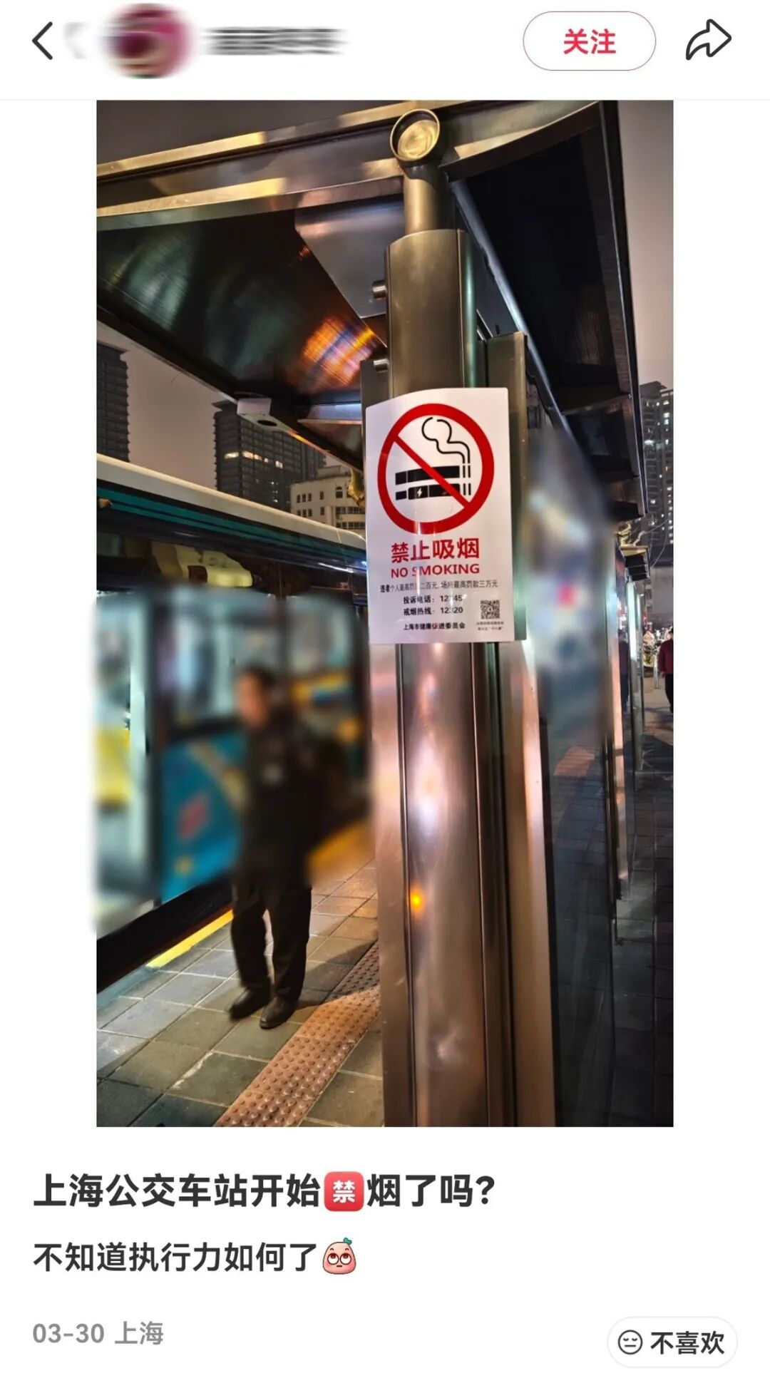 截图自社交网站记者注意到,此前发布的《上海市公共场所控制吸烟条例》规定,公共交通工具等候区域为法定禁烟场所。上海市控制吸烟协会发文称,公交车站作为人群集中的公共场所,长期以来是控烟工作的重点和难点。尽管公交站台已张贴禁烟标识,但因场所开放、人员流动大、公众对于禁烟规定知晓度不如室内公共场所高等原因,控烟状况不理想,12345、12320等渠道接到市民投诉公交站点吸烟问题的情况也较为集中突出。据上海媒体报道,3月初,上海市爱国卫生运动委员会办公室发布《2026年上海市控烟工作要点》,明确持续推进控烟行动“三部曲”即“室内全面禁烟、室外不吸游烟、吸烟请看标识”,表示将探索解决重点难点领域问题。启动公交站点法定禁烟区域划定工作,完善技术方案,推动相关政策落地。