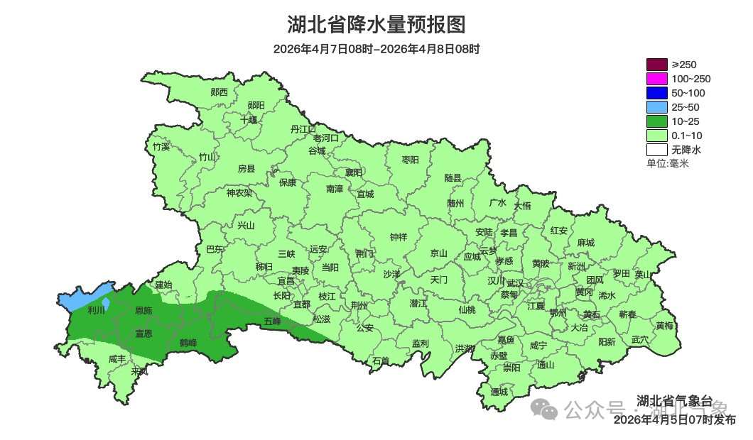 4月6日08时-7日08时,鄂西北西部、鄂西南、江汉平原、鄂东南阴天有小雨;其他地区多云。最高气温22~26℃,最低气温13~17℃,偏北风3级、阵风4到6级。