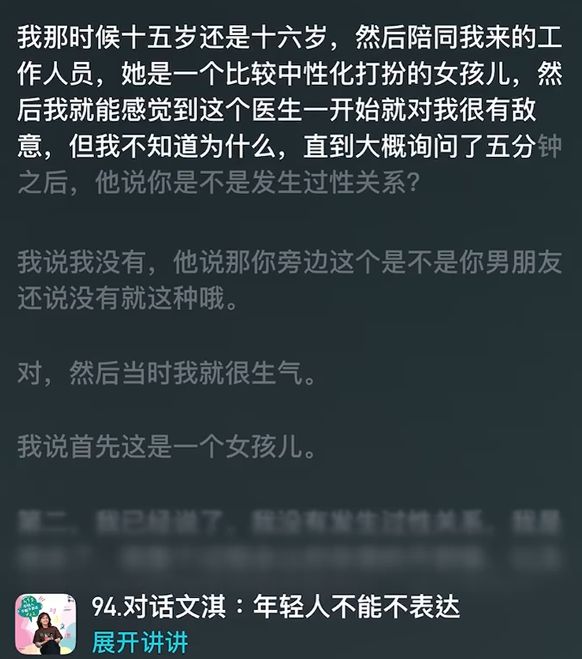 文淇回忆,整个检查过程手法极其粗暴,环境简陋、缺乏隐私保护,甚至有医学生围观,令她感到极度羞辱、恐惧与身心不适。这一经历让她长期对妇科检查产生心理阴影,也使她深刻理解女性在就医过程中面临的尴尬、羞耻与不安全感。