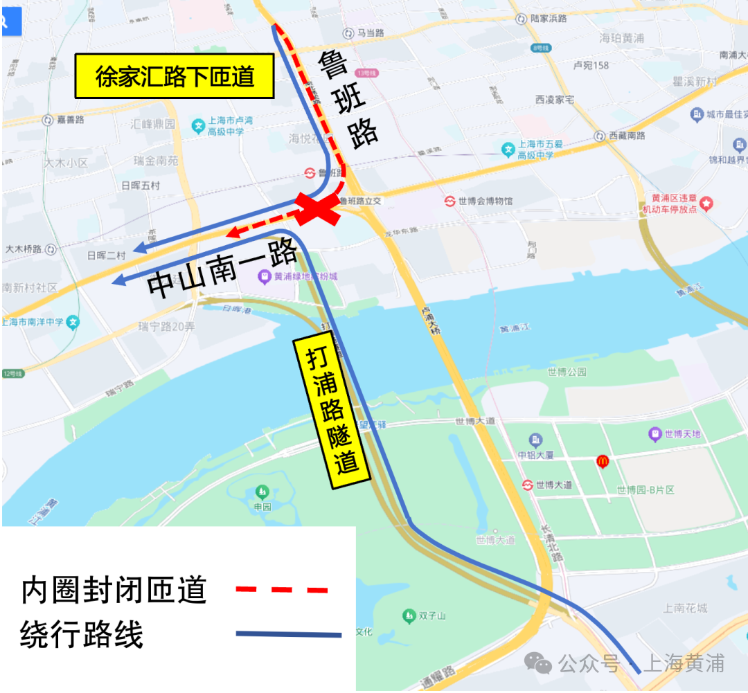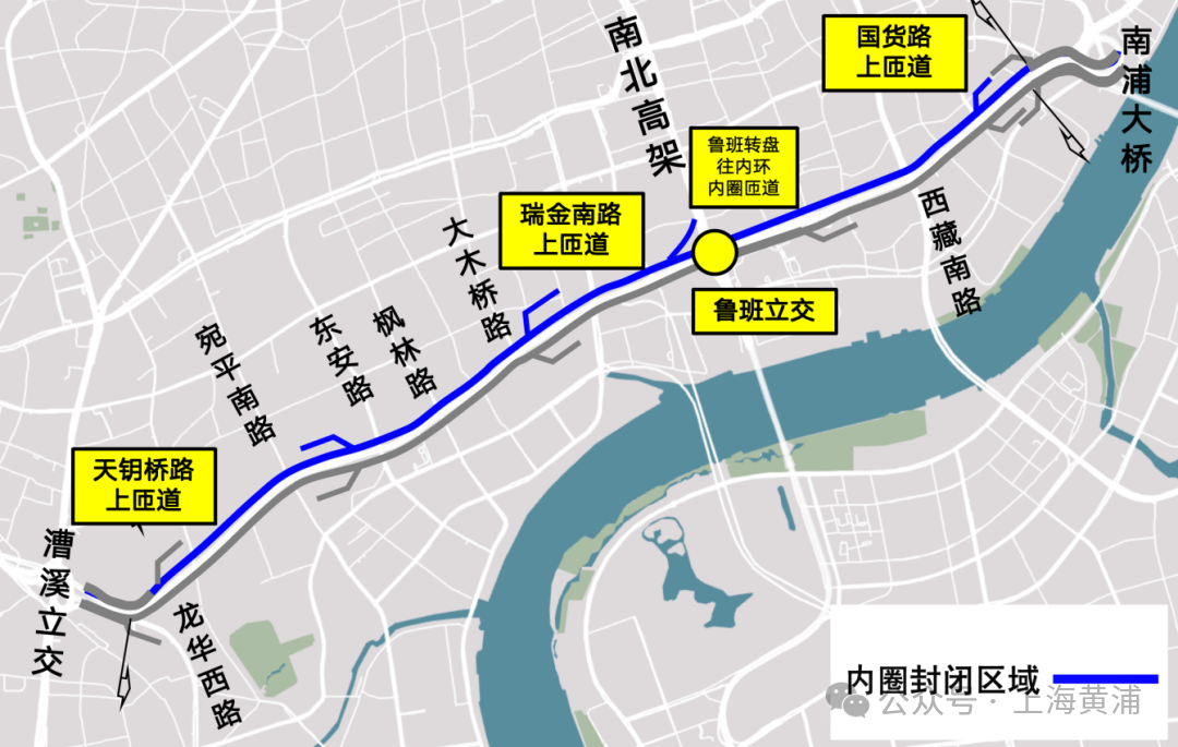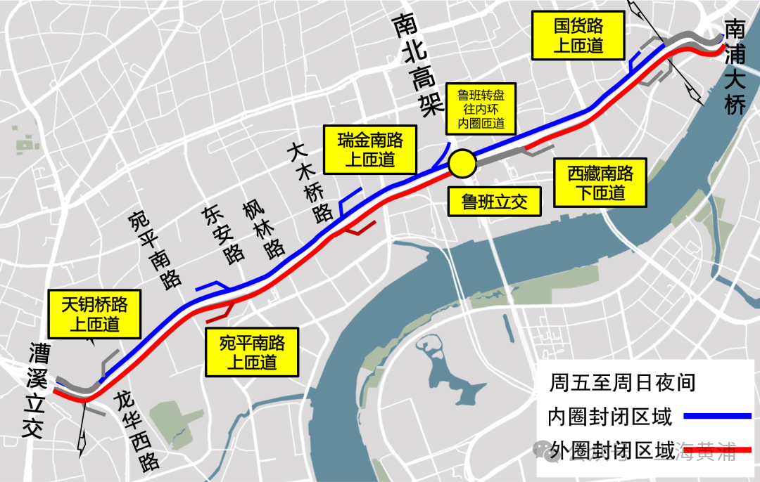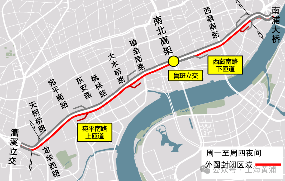■ 4月7日夜间24时至次日晨6时内环高架(龙华西路至南浦大桥)主线双向封闭,鲁班转盘往内环内圈匝道封闭。